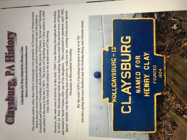 Claysburg (Hollidaysburg-13) COORDINATES: 40.280741, -78.453785 COUNTY: Blair DISTANCE TO NEXT: Hollidaysburg - 13 EXPLANATION OF NAME: Named for Henry Clay FOUNDED: 1804 MANUFACTURER: Unknown SHAPE: Standard 1-sided STATUS: Marker was rescued by local resident and is on display at their garage. Private residence. Photo of Keystone Marker by unknown